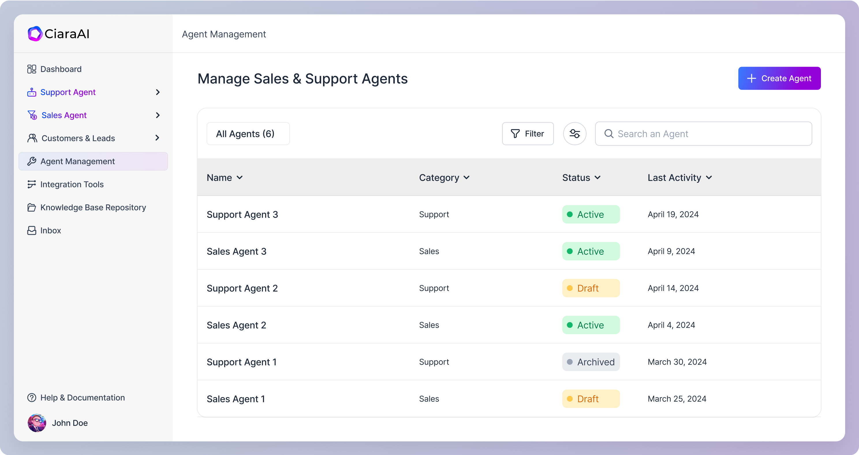 Within the agents table, identify the specific agent you want to edit. Click on the corresponding row in the table. This will take you to the agent’s detail view.