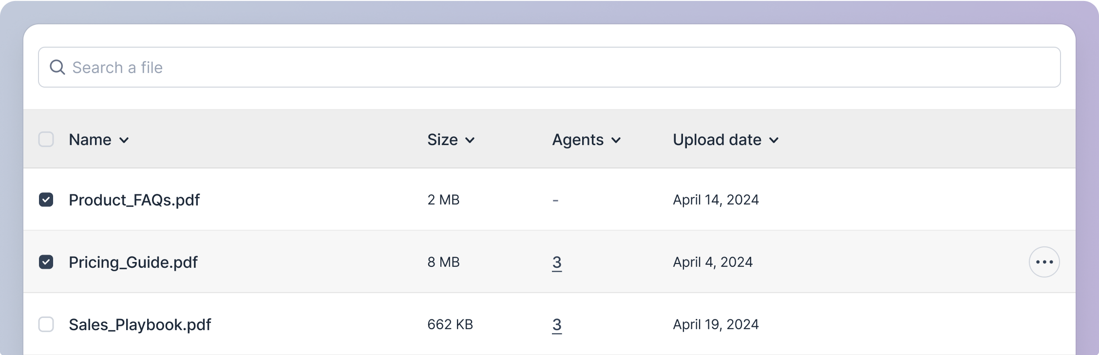 Click on the checkboxes adjacent to the file names in the file rows to select the files you want to perform an action on.