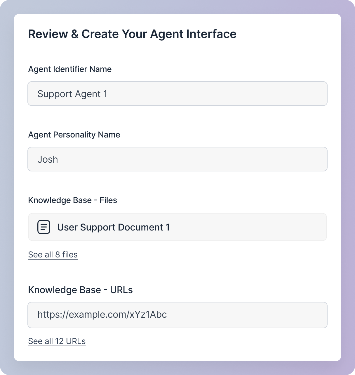 Create Agent button will remain disabled until you provide all the required details. Once all necessary details are provided, you will be able to create your agent.This section provides a summary of all the details you’ve entered while creating your sales agent. It’s a read-only view, allowing you to confirm the information you’ve provided.